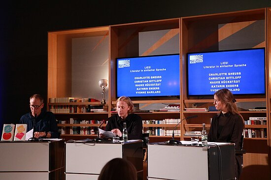 Foto zeigt Charlotte Gneuß, Christian Dittloff und Hauke Hückstädt bei der Lesung im Literaturhaus.