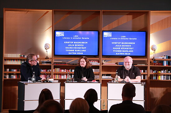 Foto zeigt Julia Schoch, Kristof Magnusson und Hauke Hückstädt bei der Lesung im Literaturhaus.