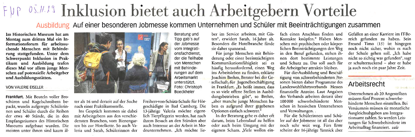 Bereits seit 2017 gibt es das inklusive Personalforum Personal.Fachkräfte.Diversity. In diesem Jahr wird es erneut zusammen mit dem Azubi-Speed-Dating der IHK Frankfurt durchgeführt und für junge Menschen mit und ohne Behinderungen gestaltet. Dabei geht es vor allem um das Thema Ausbildungsplätze für 2023. Zudem ist es bei vielen Unternehmen möglich, sich schon jetzt über Praktika oder Ausbildungsplätze für 2024 zu informieren.