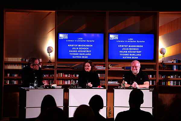 Foto zeigt Julia Schoch, Kristof Magnusson und Hauke Hückstädt bei der Lesung im Literaturhaus.